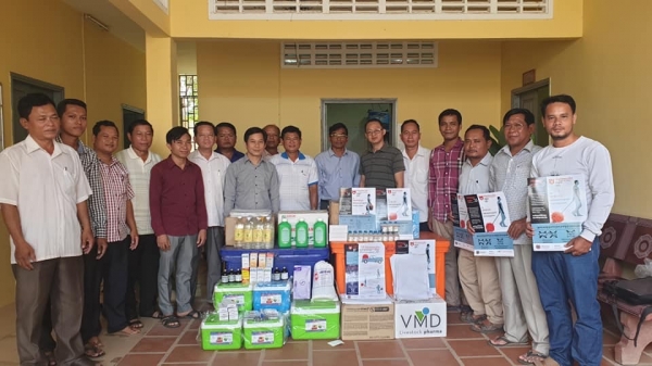 ចុងបញ្ចប់នៃកម្មវិធីប្រជុំបានបែងចែកទៅគ្រប់ផ្នែក ផលិតកម្មនិងបសុព្យាបាល ស្រុក-ក្រុងនូវថ្នាំវ៉ាក់សាំងសារទឹកគោ ក្របី ថ្នាំព្យាបាល ថ្នាំសម្លាប់មេរោគ សម្ភារ:បរិក្ខាបសុពេទ្យ មួយចំនួន និង poster អំពីជំងឺប៉េសជ្រូកអាហ្រ្វិក ជំនួយពីCP និង GDAHP) ក្រោមអធិបតីលោក ហៃ ធូរ៉ា អនុប្រធានមន្ទីរ និងលោក ឡាយ វិសាល អនុប្រធានក្តាប់រួមការិយាល័យរដ្ឋបាលបុគ្គលិកផងដែរ។