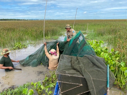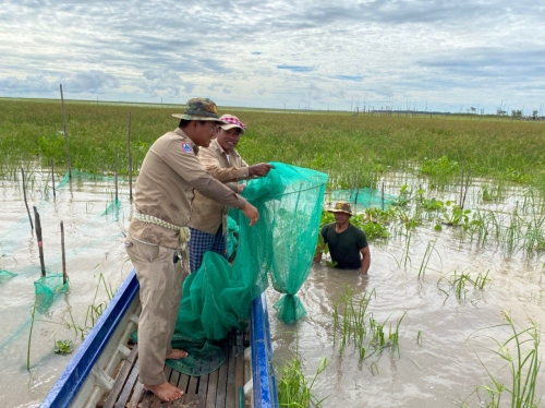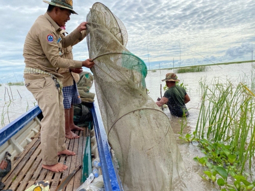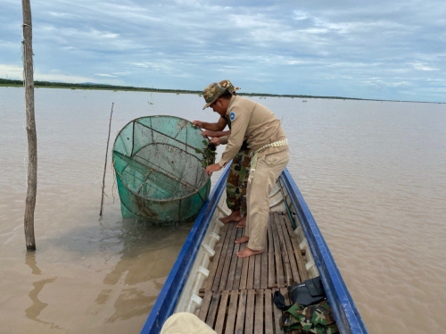 ថ្ងៃចន្ទ ៦រោច ខែស្រាពណ៍ ឆ្នាំជូត ទោស័ក ពស ២៥៦៤ ត្រូវនឹងថ្ងៃទី១០ ខែសីហា ឆ្នាំ២០២០ ក្រុមការងារ នៃ មន្ទីរកសិកម្ម រុក្ខាប្រមាញ់ និង នេសាទខេត្ដពោធិ៍សាត់ ដឹកនាំដោយលោក ភុន សុវណ្ណា នាយផ្នែករដ្ឋបាលជលផលក្រគរ រួមសហការជាមួយ លោក យូ សុវិចិត្រ នាយសង្កាត់រដ្ឋបាលជលផលកំពង់លួង និងកម្លាំងយោធានៃតំបន់ប្រតិបត្តិការសិករងខេត្តពោធិសាត់ បានចេញប្រតិបត្តិការបង្ក្រាបបទល្មើសនេសាទចាប់ពីចំនុចជ្រោយស្ដី ដល់ភូមិត្រពាំងរំដេញ ឃុំ ក្បាលត្រាច ស្រុកក្រគរ ជាលទ្ឋផលបង្ក្រាប បាន០១ករណី ។ វត្ថុតាងបំផ្លាញចោលរួមមាន :
