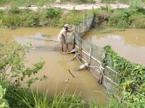ថ្ងៃអង្គារ៦រោច ខែភទបទ្រ ឆ្នាំជូត ទោស័ក ព.ស២៥៦៤ ត្រូវនឹងថ្ងៃទី ០៨ខែ កញ្ញា ឆ្នាំ ២០២០ ផ្នែករដ្ឋបាលជលផល រាំងទិល បានសហការជាមួយប៉ុស្តិនគរបាលរដ្ឋបាលខ្នារទទឹងនិងអាជ្ញារធ័មឃុំខ្នារទទឹង បានចុះប្រតិបត្តិការនៅចំណុចប្រឡាយក្រូចសើច ភូមិក្រូចសើច ឃុំខ្នារទទឹង ស្រុកបាកាន បានប្រទះឃើញការនេសាទដោយឧបករណ៏របាំងព្រួល រួមផ្សំលូ ស្បៃមុងកាត់ទទឹង ប្រឡាយសមត្ថកិច្ចចម្រុះបានឯកភាពចុះរុះរើវត្ថុតាងចោលនៅនិងកន្លែងបាន ០១ករណី វត្ថុតាងបំផ្លាញចោលរួមមាន ៖ លូ ស្បៃមុង ចំនួន ០៨ មាត់,របាំងស្បៃមុងប្រវែង ១៨០ ម,របាំងរួមផ្សំ៣ម×៥ម ចំនួន ២០ផែនចំនួន ០៦ខ្សែ,បង្គោលចម្រឹងចំនួន ១២០ដើមនិង លែងកូនត្រីចម្រុះ ទម្ងន់ ០៥គក្រ។