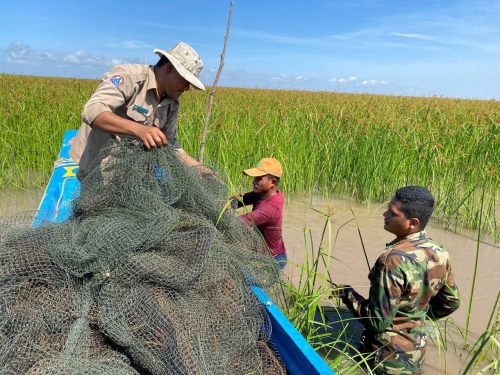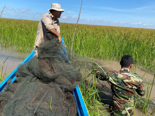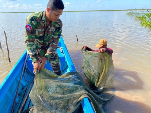 នាយរងអធិការដ្ឋានរដ្ឋបាលជលផលខាងត្បូងបឹងទន្លេសាប និងមន្ដ្រីជំនាញជាច្រើនរូបទៀត ដោយប្រើកម្លាំងសរុប១៩នាក់ មធ្យោបាយកាណូតចំនួន ០៤គ្រឿង ចុះត្រួតពិនិត្យ និងបង្រ្កាបបទល្មើសជលផលនៅព្រំប្រទល់ ខេត្ដ ពោធិ៍សាត់ កំពង់ឆ្នាំង