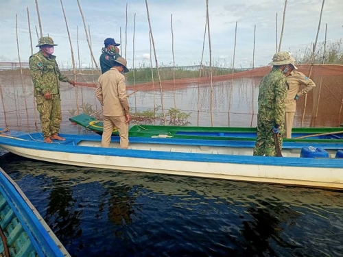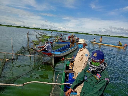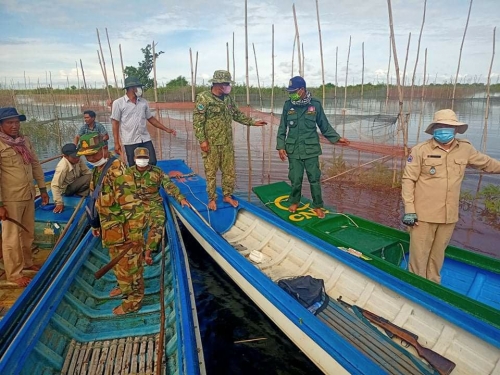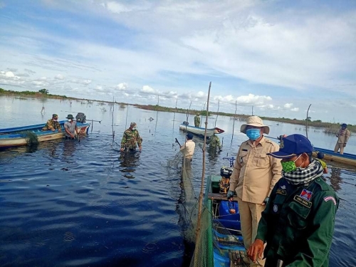 ថ្ងៃ ពុធ ២រោច ខែស្រាពណ៍ ឆ្នាំឆ្លូវត្រីស័ក ព.ស ២៥៦៥ ត្រូវថ្ងៃទី២៥ខែ សីហា ឆ្នាំ២០២១ នៅវេលាម៉ោង៨ និង១៥នាទី កម្លាំងសរុប ១៩នាក់ កាណូត០៥ផ្នែករដ្ឋបាលជលផល រាំងទិលបានសហការ បរិស្ថាន . យោធាខេត្ត . កម្លាំងប៉ុស្តិ៍នគរបាលមេទឹក និងសហគមន៍នេសាទព្រែកក្រ បានចុះធ្វើរុះរើបំផ្លាញចោលឧបករណ៍ ទំនើបក្នុងរដូវបិទនេសាទ នៅចំណុច ព្រំប្រទល់ក្បាលតោ រហូត