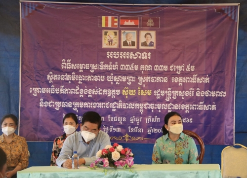 ថ្ងៃ អាទិត្យ ១១កើត ខែផល្គុន ឆ្នាំ ឆ្លូវ ត្រីស័ក ព.ស ២៥៦៥ ត្រូវនឹងថ្ងៃទី ១៣ ខែ មិនា ឆ្នាំ ២០២២ លោក ឡាយ វិសិដ្ឋ ប្រធានមន្ទីរ និងសហការី បានចូលរួមក្នុងពិធី សម្ភោធស្រះទឹកខ្នាតយក្ស ដែល មាន ទទឹង ប្រវែង ៣០ ម៉ែត្រ បណ្តោយ ប្រវែង ៣៣៥ ម៉ែត្រ និង ជម្រៅ ៥ ម៉ែត្រ ស្ថិតនៅភូមិ ធ្នោះតាចាប ឃុំស្នាមព្រះ ស្រុក បាកាន ក្រោមអធិបតីភាពដ៏ខ្ពង់ខ្ពស់ ឯកឧត្តម ស៊ុយ សែម រដ្ឋមន្ត្រីក្រសួងរ៉ែ និងថាមពល និងជាប្រធានក្រុមការងាររាជរដ្ឋាភិបាលចុះមូលដ្ឋានខេត្តពោធិ៍សាត់ ដោយមានការអញ្ជើញចូលរួមពីប្រតិភូអមដំណើររួមមាន ឯកឧត្តម ម៉េង សក្តិធារ៉ារដ្ឋលេខាធិការក្រសួងរ៉ែ និង ថាមពល និងជាប្រធានក្រុមការងាររាជរដ្ឋាភិបាលចុះមូលដ្ឋានស្រុកបាកាន ,ឯកឧត្តម យស់ មុន្នីរ៉ាត់ អនុរដ្ឋលេខាធិការ ក្រសួងរ៉ែ និង ថាមពល,ឯកឧត្តម លោកជំទាវ