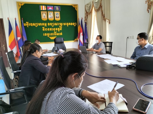 ថ្ងៃព្រហស្បតិ៍ ១២កើត ខែពិសាខ ឆ្នាំខាល ចត្វាស័ក ព.ស ២៥៦៥ ត្រូវនឹង ថ្ងៃទី១២ ខែឧសភា ឆ្នាំ២០២២លោកស្រី ជ័យ ចន្នី អនុប្រធានមន្ទីរកសិកម្ម រុក្ខាប្រមាញ់ និងនេសាទខេត្តពោធិ៍សាត់ និងលោកស្រី សូ ផាន់ណា អនុប្រធានការិយាល័យកសិឧស្សាហកម្ម បានចូលរួមប្រជុំ ស្តីពីផ្តល់ប្រឹក្សាមតិយោបល់លើការវាយតម្លៃ តម្រូវការនៃគម្រោងស្តារឡើងវិញនូវវិស័យ កសិអាហារ និងវិស័យទេសចរណ៍ ក្នុងបរិការណ៍កូវីដ១៩ (AFTER អាហ្វធើ) របស់អង្គការសហប្រជាជាតិដើម្បីអភិវឌ្ឍន៍ ឧស្សាហកម្ម (UNIDO) ។ កិច្ចប្រជុំធ្វើនៅមន្ទីរឧស្សាហកម្ម វិទ្យាសាស្រ្ត បចេ្ចកវិទ្យា និងនវានុវត្តន៍ ។ ក្រោមការសម្របសម្រួលដោយលោក ទឹម រុនស៊ីណារិទ្ធិ ទីប្រឹក្សាបច្ចេកទេសនៃគម្រោង ។ កិច្ចប្រជុំ មានគោលបំណងដើម្បីស្វែងយល់ពីសមត្ថភាពដែលចាំបាច់សម្រាប់មន្រ្តីរាជរដ្ធាភិបាលអនុវត្តសកម្មភាពនៃការស្តារឡើងវិញសម្រាប់ទាំងវិស័យកសិអាហារ និងវិស័យទេសចរណ៍ក្នុងបរិបទកូវីដ១៩ និងបង្កើតជាសំនួរចម្លើយតាមតម្រូវការដែលពាក់ព័ន្ធទៅតាមស្ថាប័ន ។ អ្នកចូលរួមមាន: មន្ទីរទេសចរណ៍ មន្ទីរបរិស្ថាន មន្ទីរឧស្សាហកម្ម និងមន្ទីរកសិកម្ម សរុបចំនួន ៨នាក់ ស្រី៤នាក់ ។