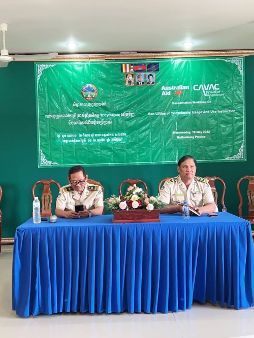 ថ្ងៃពុធ ៣រោច ខែពិសាខ ឆ្នាំខាល ចត្វាស័ក ព.ស ២៥៦៦ ត្រូវនឹង ថ្ងៃទី១៨ ខែឧសភា ឆ្នាំ២០២២ លោក ឡេង ចិន្ដាមុនី ប្រធានការិយាល័យនីតិកម្មកសិកម្ម និងលោកស្រី សន សុវណ្ណនី អនុប្រធានការិយាល័យ នៃមន្ទីរកសិកម្ម រុក្ខាប្រមាញ់ និងនេសាទ ខេត្តពោធិ៍សាត់ បានអញ្ជេីញចូលរួម សិក្ខាសាលាស្តីពី បច្ចេកទេសប្រេីប្រាស់ថ្នាំកសិកម្ម TricycIazoIe អោយស្របតាមស្តង់ដានៃការធ្វើពាណិជ្ជកម្ម និងស្របតាមកម្រិតអនុគ្រោះជាអប្បបរមាក្រោមអធិបតីភាព លោក ភ៉ំ រ៉ា ប្រធាននាយកដ្ឋាននីតិកម្មកសិកម្ម នៃក្រសួងកសិកម្ម រុក្ខាប្រមាញ់ និងនេសាទ សរុបនាក់ចូលរួម ៨០នាក់ ស្រី១៥នាក់ ។