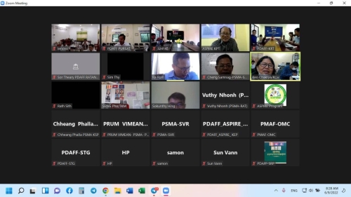 ថ្ងៃព្រហស្បតិ៍ ១០កើត ខែជេស្ឋ ឆ្នាំខាល ចត្វាស័ក ព.ស ២៥៦៦ ត្រូវនឹង ថ្ងៃទី៩ ខែមិថុនា ឆ្នាំ២០២២ លោក ហ៊ន់ សុវណ្ណ ប្រធានការិយាល័យផ្សព្វផ្សាយកសិកម្ម និងជាមន្រ្តីទទួលបន្ទុកត្រួតពិនិត្យ និងវាយតម្លៃកម្មវិធី ASPIRE ខេត្តពោធិ៍សាត់ និងលោកទីប្រឹក្សា ព្រមទាំងមន្រ្តីអនុវត្តកម្មវិធី ASPIRE ស្រុក/ក្រុង បានចូលរួមកិច្ចប្រជុំណែនាំស្តីពីការប្រើប្រាស់ប្រព័ន្ធព័ត៌មានសម្រាប់ការគ្រប់គ្រងនៃកម្មវិធី ASPIRE តាមរយៈប្រព័ន្ធបញ្ជូនរូបភាព និងសំឡេង Zoom Meeting ។ គោលបំណងនៃកិច្ចប្រជុំ ដើម្បីពិនិត្យនូវវឌ្ឍនភាពនៃការបញ្ចូលទិន្នន័យ ស្វែងយល់ពីបញ្ហាផ្សេងៗ ព្រមទាំងដំណោះស្រាយក្នុងការគ្រប់គ្រងទិន្នន័យឆ្នាំ២០២២ ។