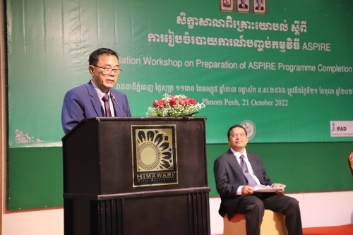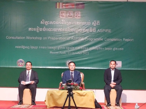 ថ្ងៃសុក្រ ១១រោច ខែអស្សុជ ឆ្នាំខាល ចត្វាស័ក ព.ស ២៥៦៦ ត្រូវនឹង ថ្ងៃទី២១ ខែតុលា ឆ្នាំ២០២២ លោក ហ៊ន់ សុវណ្ណ ប្រធានការិយាល័យផ្សព្វផ្សាយកសិកម្ម និងលោក មួន វុឌ្ឍី អនុប្រធានការិយាល័យផលិតកម្មនិងបសុព្យាបាលបានចូលរួមសិក្ខាសាលាពិគ្រោះយោបល់ស្តីពីការរៀបចំរបាយការណ៍បញ្ចប់កម្មវិធី ASPIRE (ASPIRE Programme Completion Report - PCR) នៅសណ្ឋាគារហ៊ីម៉ាវ៉ារី (Himawari Hotel) រាជធានីភ្នំពេញ ។ ក្រោមអធិបតីភាព ឯកឧត្តមមាស ពិសិដ្ឋ អនុរដ្ឋលេខាធិការក្រសួងកសិកម្ម រុក្ខាប្រមាញ់ និងនេសាទ និងជានាយកកម្មវិធី ASPIRE តំណាងមកពីក្រសួងសេដ្ឋកិច្ច និងហិរញ្ញវត្ថុ ឧត្តមក្រុមប្រឹក្សាសេដ្ឋកិច្ចជាតិ លេខាធិការដ្ឋាន គ.ជ.អ.ប អគ្គនាយកដ្ឋានកសិកម្ម នាយកដ្ឋានផែនការស្ថិតិ នាយកដ្ឋានផ្សព្វផ្សាយកសិកម្ម រុក្ខាប្រមាញ់ និងនេសាទ សាលកវិទ្យាល័យភូមិន្ទកសិកម្ម វិទ្យាស្ថានជាតិកសិកម្មព្រែកលៀប និងមន្ទីរកសិកម្ម រុក្ខាប្រមាញ់ និងនេសាទទាំង២៤ខេត្ត ។